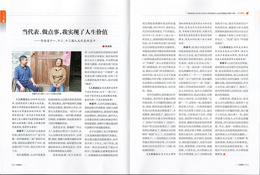 林善平:虹潤公司是民營的國家高新技術(shù)企業(yè)、國家專精特新小巨人企業(yè),處于國內(nèi)顯示控制儀表行業(yè)的領(lǐng)先地位。沒當(dāng)選代表前,我的人生目標(biāo)只有一個(gè)——“造一流儀表”,而自從跨進(jìn)議政履職平臺(tái)后,我的人生目標(biāo)又增加了一個(gè)——“當(dāng)稱職的代表”。為了當(dāng)好代表,我在履職之初就給自己劃了一條“底線”:本職工作和商務(wù)活動(dòng)再忙,只要是人大的會(huì)議、省市人大組織的集體履職活動(dòng),就必定參加。如果時(shí)間上有沖突,公司的事就“讓路”一下。記得有一次,我到福州參加省人代會(huì),一位客商在順昌的公司總部等了我好幾天,最后等不住,只好取消了合作。即便如此,我仍然不改初衷。而且,于我來說,履職對(duì)我更好地經(jīng)營管理企業(yè)有很大的幫助。擔(dān)任代表職務(wù),使我開闊了視野,對(duì)黨和國家的大政方針政策、法律法規(guī)有了更多更好的領(lǐng)會(huì),民主意識(shí)、法治意識(shí)、誠信意識(shí)更強(qiáng)了,有助于辦好企業(yè)、規(guī)范管理、開拓市場、規(guī)避風(fēng)險(xiǎn)。10多年來,公司的核心競爭力不斷增強(qiáng),生產(chǎn)與銷售持續(xù)領(lǐng)跑全行業(yè),被評(píng)為國家知識(shí)產(chǎn)權(quán)優(yōu)勢企業(yè)、福建省七家入選國家智能制造標(biāo)準(zhǔn)應(yīng)用試點(diǎn)企業(yè)之一、福建省十家院士專家示范工作站之一,“虹潤”成為“中國馳名商標(biāo)”。
