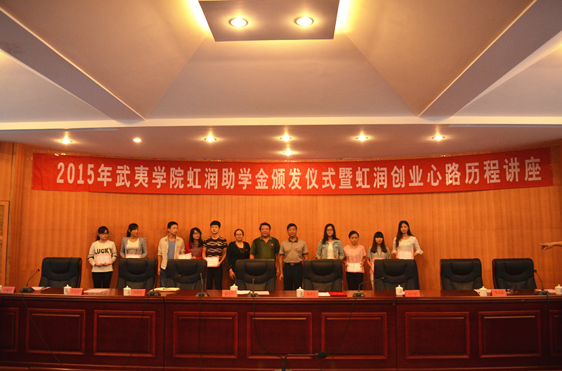 姚進(jìn)生、林善平等與會領(lǐng)導(dǎo)為獲得虹潤助學(xué)金的同學(xué)頒發(fā)了證書。林善平用自己的創(chuàng)業(yè)歷程告訴同學(xué)們要尊重自我,在暫時的逆境中砥礪品格,磨練意志,用自己的努力不斷增長知識和才干,在以后的人生歷程中選擇更輝煌的道路。